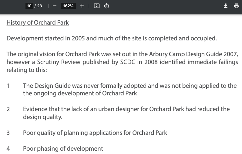 I’m assuming this has been superseded by Policy SS/1: on p46/58 on Orchard Park in the South Cambridgeshire Local Plan 2018 – in fact it confirms that the 2011 SPD will need updating on p324/(336 of the PDF) in Appendix G.