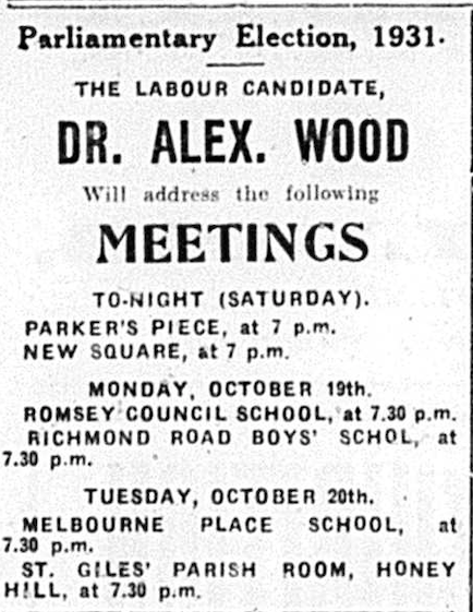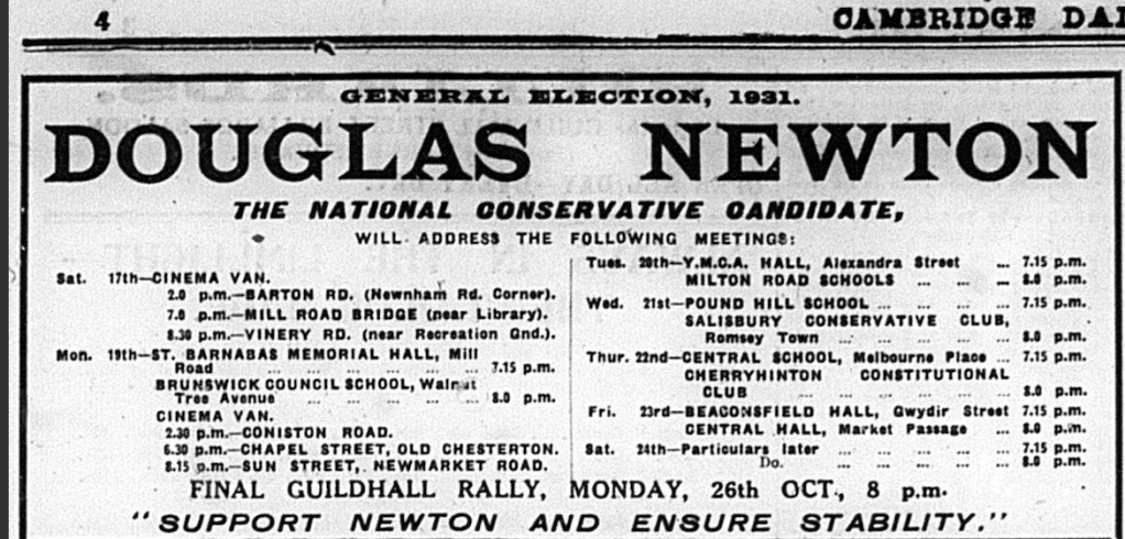 Newspaper adverts from Cambridge Borough candidates Douglas Newton (Conservative), and Dr Alex Wood (Labour) – note the use of both school halls, and also the recently-invented ‘cinema vans’. Anyone planning on using tablets and portable speakers for centrally-produced campaign videos?