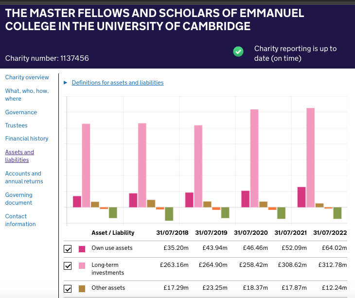 Which is unfortunate given the significant assets Emmanuel College has, along with the underspend in the most recent set of accounts submitted to the Charity Commission for 2021/22. You can browse through their accounts here