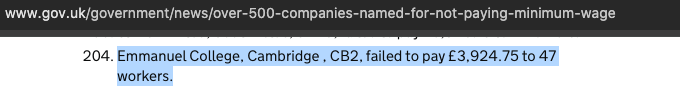 Above: “Emmanuel College, Cambridge , CB2, failed to pay £3,924.75 to 47 workers.” Government press release from Department for Business and Trade, 20 February 2024.