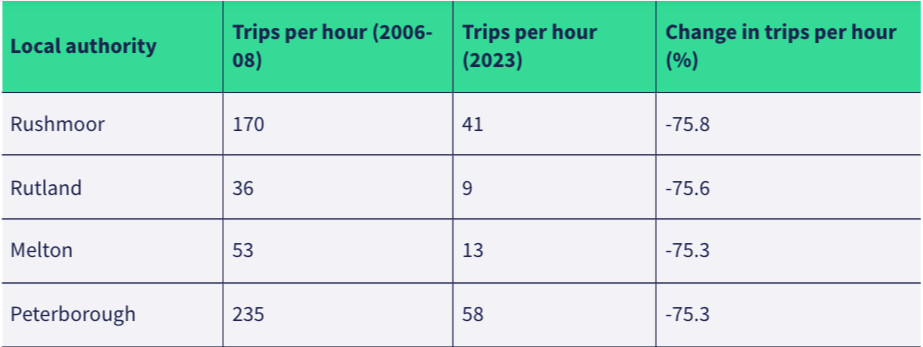 Above – note the reduction in bus trips per hour by over 75% for Peterborough between 2006-08 and 2023. By Friends of the Earth Nov 2023 here.