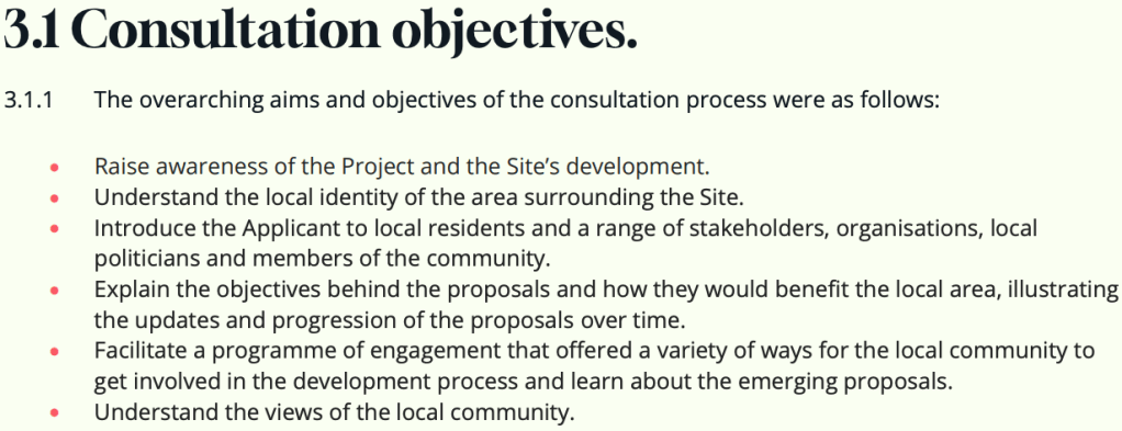 When it came to the consultation period prior to submitting the planning application – normally the one where residents have at least some chance of influencing a few things, the volume of responses given the scale of the development was utterly miserable.