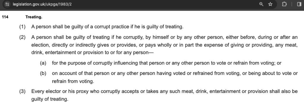 “A person is guilty of treating if either before, during or after an election or referendum they directly or indirectly give or provide (or pay wholly or in part the expense of giving or providing) any food, drink, entertainment or provision in order to influence any voter to vote or refrain from voting. Corrupt practice, s114 RPA 1983.”