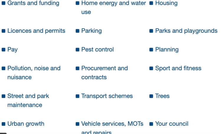 Instead, have a look at Cambridge City Council’s website (see https://www.cambridge.gov.uk/ then scroll about a third of the way down and click on the Menu box. It will come up with a list like this: