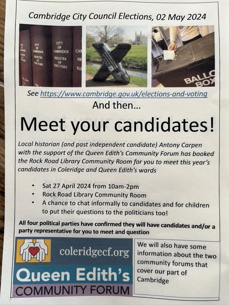 Above – the poster for the event, which I’ve also added to the FB Calendar for the Queen Edith’s Community Forum. (Also here’s an EB-link for anyone who wants to help contribute towards the room-booking costs.)