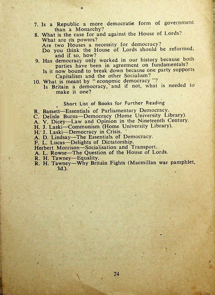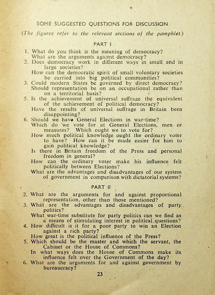 In one of several guides by the old Association for Education in Citizenship (could it be reformed? Does it exist under a different name), this pamphlet invites the reader to discuss a series of questions.