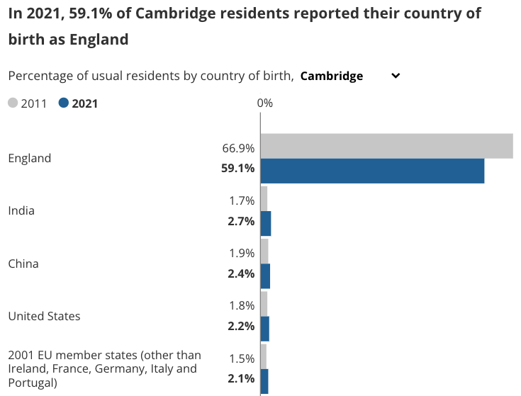In the grand scheme of things, the Government’s ambitions for Cambridge is incompatible with its policies on who has the right to vote. Looking at the 2021 census figures we can see that over 40% of Cambridge residents were born outside of England. Note that does not mean they are all not UK citizens. Many acquired citizenship a long time ago, while others were, due to the quirks of Empire, born with citizenship even though their place of birth may have been a British colony at the time.