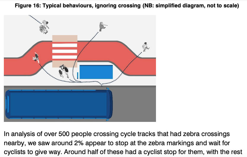 The guide also discusses when cyclists choose to ignore the cycle lanes and stick to the roads – especially the faster, physically fitter, and perhaps more confident cyclists, who may simply see the zebra crossing as an unwanted delay or interruption on their journey. (Note some of the offences that can be committed by cyclists)
