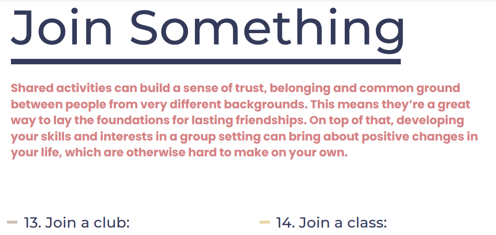 I’m leaving out the first three themes because they are personal by their nature. Changing the habits of individuals, changing negative thought processes, and choosing to ‘help out’ are dependent on a whole host of things and can take a very long time to achieve – especially the first two. Furthermore, there is no guarantee that ‘helping out’ generically will give the personal satisfaction/boost that many of us seek (consciously or subconsciously) when we do so. Part of that theme has to involve taking the ‘shame’ away from failure or things not going as we planned. At the same time, what are the circumstances that help is being offered? Is it enthusiastically? Reluctantly? Under duress?
