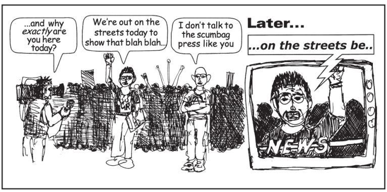 This reminded me of the anti-globalisation protests (themed around equal rights, environmentalism, and taking on the power of multinational corporations) in London & Brighton back in the early 2000s. In particular the pamphlet by Schnews in Brighton against one particular prominent group seen at many a street protest or march.