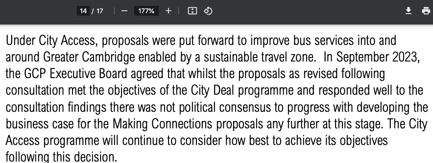 Essentially it was preparing for the next assessment from civil servants and ministers. You can read through the agenda pack of the last meeting on 07 March 2024 here. It’s not clear what happened to the revised proposals (see here) from the GCP following the very clear message the electorate sent the political parties – one that forced the climb-down on road user charging. I got the sense at the time that transport officers were panicking about what to do because they had no contingencies for their busway plans or road user charging plans being politically undeliverable. This was ultimately confirmed by the Combined Authority in the Greater Cambridge section of their Local Transport & Connectivity Plan.