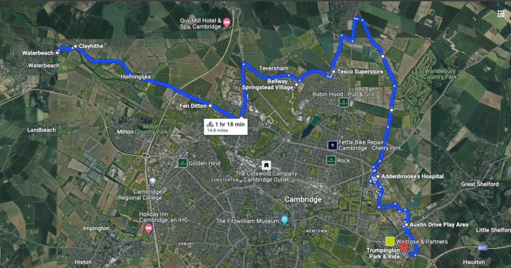 The traditional mindset of transport planning is A-to-B commuting. The problem is outside of the Home-to-work-to-home-again lifestyle, it doesn’t meet the wider needs of society. Furthermore, this route from Waterbeach via Teversham to Trumpington tries to meet the needs of communities in the very new and proposed developments including North Cherry Hinton, Marleigh, Clay Farm (all under construction) as well as Waterbeach New Town and the Airport site which are part of the emerging local plan 2031-40.