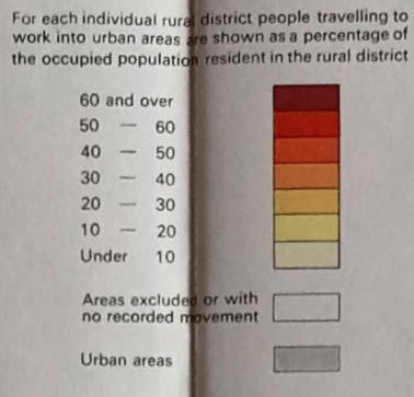 The grey areas are urban districts while the rural areas are the yellow-orange shaded areas. The key below shows the percentage of the population in each old rural district (pre-1974 changes) that commuted to an urban area.
