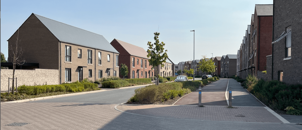 Above – in a recently-completed part of Marley, a wide cyclepath separate to the footway and segregated from the road. The challenge – as I found on The Tins Cycleway (featured in this 2016 CamCycle Article) will be the maintenance.