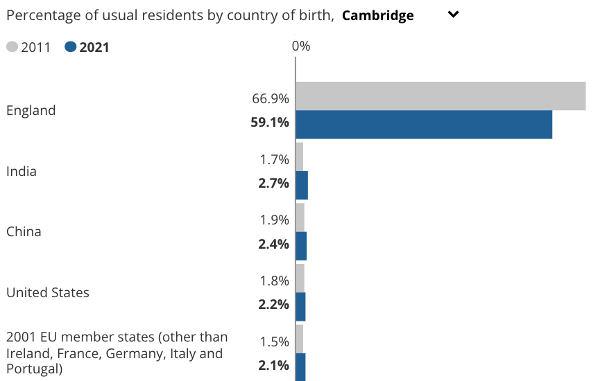 The total for Cambridge residents born in England may seem low, but it does not cover Scotland, Wales, and Northern Ireland. Furthermore, residents identifying as White British in Cambridge in 2021 was just under 75%. Finally, there is still the tail end of the decline of Empire where long term residents may have been born abroad but whose ancestors were born in the UK – such is the case of at least two of my great-grandfathers. (But you wouldn’t guess that from looking at me!)