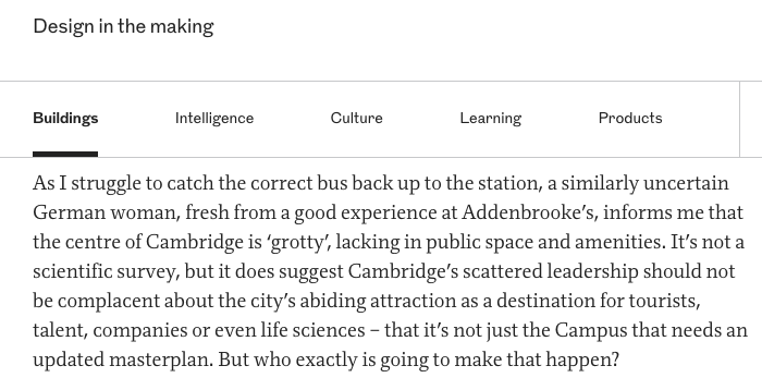 Familiar ones that local residents have been raising for decades but to which few national publications have been listening to. Which actually comes as no surprise in a place like Cambridge where an individual’s influence is tied to the institution they represent or are part of. I saw this phenomenon across the country during my civil service days where the influence of having the name of a Whitehall department behind your words went a very long way – longer than it should have done if I’m honest. It reflects the over-centralised structure of government.