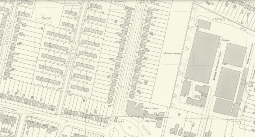 Above – centre-left in rows of three and four either side of Lichfield Road (with the big warehouses of The Paddocks – now up for redevelopment) from the National Library of Scotland – see here for the map of the pre-fabs next to Coleridge Rec