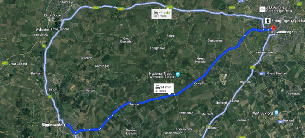Above – Biggleswade to Cambridge on G-Maps