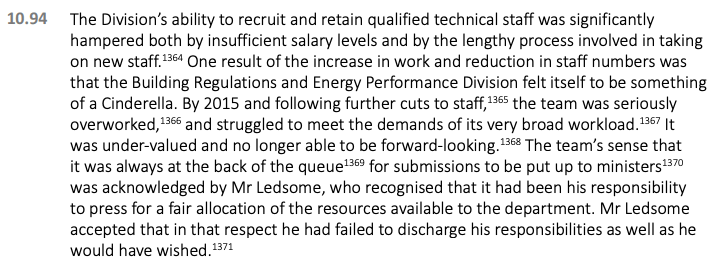 “Between 2006 and 2015 the number of staff within the Building Regulations Division had been significantly reduced. In 2006 there had been 14 construction professionals and three Grade 6 civil servants in a division whose responsibilities were narrower than they later became. By 2015 that had fallen to five technical specialists and one Grade 6 official. As a result the department’s capacity was significantly below that which some officials thought was really required.”