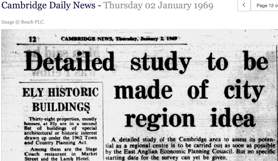 Above – Confirmation of a new regional economic study for Cambridge – Cambridge Evening News 02 Jan 1969 in the British Newspaper Archive.