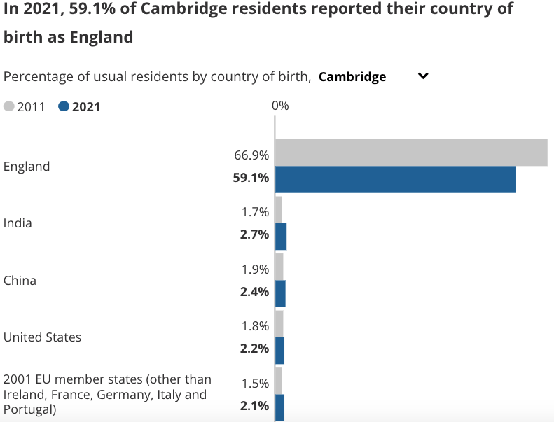 Above – from the Census 2021. I’ll leave it to you to calculate/estimate the percentage of citizens of foreign countries permanently resident in Cambridge unable to vote in local elections.