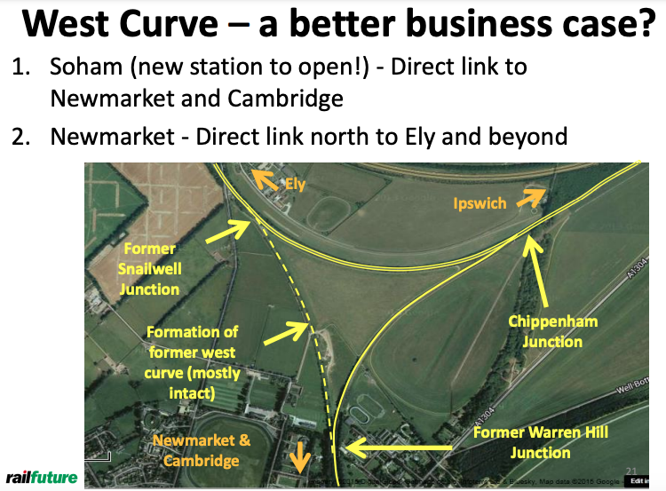 Above – from the Rail Future Newmarket presentation from 2019. If the GCP had not been so parochial and narrow-minded they could have put up some funding to have gotten this link reinstated, providing an alternative route for trains from Cambridge to Ely every time the line through Waterbeach went down.