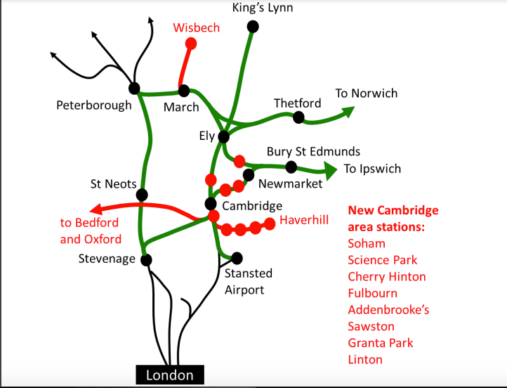 While I prefer the concept of the rail loops as I wrote here, the improvements to the track and network should enable crawler services from Wisbech all the way through to Haverhill via March, Chatteris, Ely, Soham, and Cambridge. The benefit of this *if* the Cambridge-Newmarket line is properly upgraded is that the science parks being built at Coldham’s Lane, west of Cherry Hinton, and Fulbourn, along with the Biomedical Campus, are all ‘connectable’ with those currently cut-off Fenland towns.