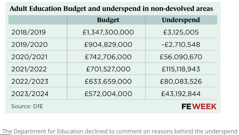 “Julian Gravatt, deputy chief executive at the Association of Colleges, said “complexity and underfunding” of adult education budgets had been a longstanding problem that contributed to underspends in the 2010s.”