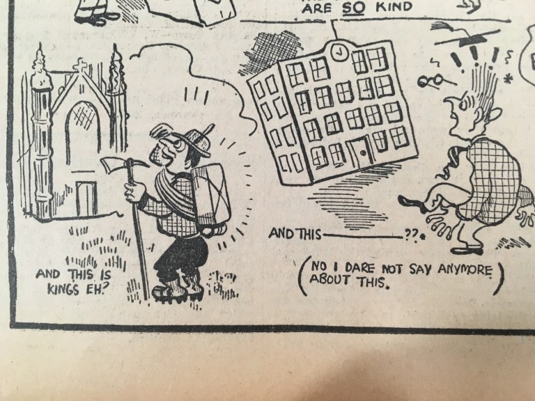 Above – Ronald Searle lampooning the unpopular Guildhall design – hated by many in the 1930s. From the Cambridge Daily News 03 Oct 1936, in the Cambridgeshire Collection.