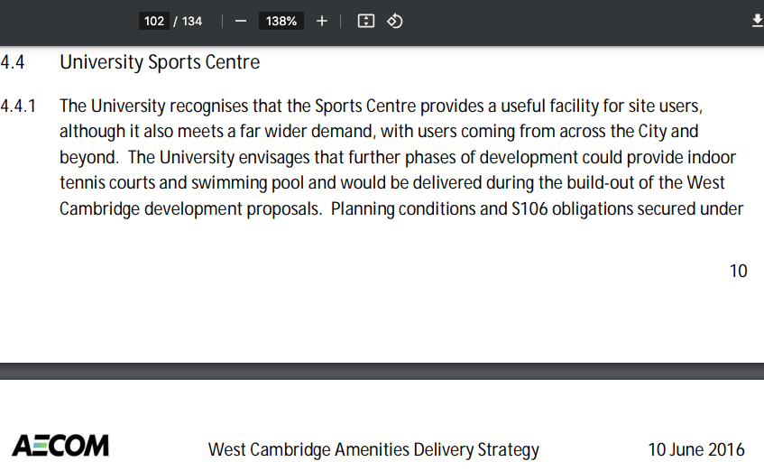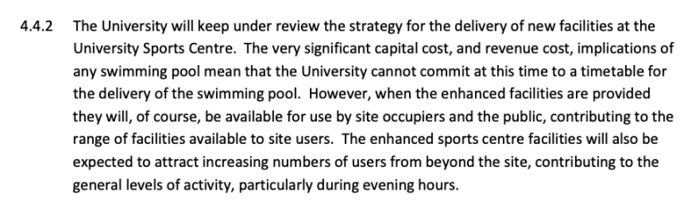 “We have received the planning consent for the West Cambridge Masterplan that includes an outline for a swimming pool adjacent to the sports centre.”