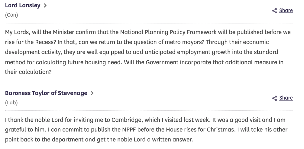 Lord Watts (Lab) : “My Lords, does the Minister agree with me that, to increase the number of houses available, we will need to deal with the way housebuilders keep some of the stock off the record and land-bank? Will we do something about land-banking to make sure that, if developers do not develop land, someone else will?”