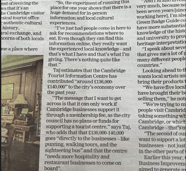 Browsing through this week’s Cambridge Independent newspaper (available in/around our city, requires £subscription online) either side of a music rehearsal, I spotted this article about Cambridge’s independently run and independently-funded tourist information centre at The Guildhall. (See also https://www.cambridgetouristinformation.co.uk/about/)