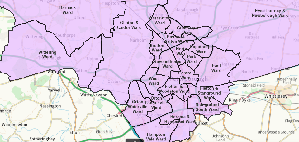 If you look at the geographical boundary of Peterborough City Council, its large rural wards east and west of it (Lincolnshire over the county border is to its north) are clearly visible
