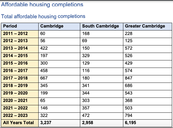Above – Annual Monitoring Report, Cambridge City, South Cambs District, 2022-23, table A2.15 p187