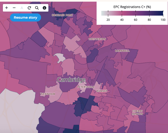 Note the data is disaggregated further into sub-ward levels – ‘Lower Super-Output Area’ as referred to in public sector statistical circles. You can see the developments close to Cambridge Railway Station have had an impact on the results – the darker shading indicating that more homes have had EPC assessments and they have been at C or above. Ditto Orchard Park at the top. It reminds us however, that there is a huge retrofitting task ahead to improve the energy efficiency of our residential buildings. What the map helps local policy makers decide is which parts of the city to begin with. That will also be affected by information on ownership of properties, through to income and poverty data. For example the policies councils and/or ministers might use for home owner-occupiers won’t be the same as those for institutional private landlords with multiple properties scoring below level C. Evidence-based policy-making? That. Only this example shows that while the broad principles and national framework can be set in Whitehall, the local application and local delivery must be decided locally – and those local councils must be properly empowered and resourced to do this.