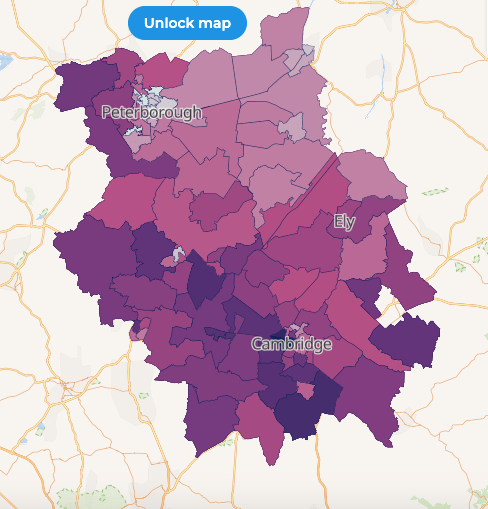 I’m interested in Cambridge, so I want to zoom into the data about Cambridge rather than the CPCA region. The dashboard allows me to do this by clicking on the health and wellbeing top tabs, and scrolling down to one of the illustrated data sets in the form of a county data map (as shown below left) – such as average life expectancy at birth. I click on ‘unlock map’ and zoom into the geographical area of Cambridge within the county – as below-right.