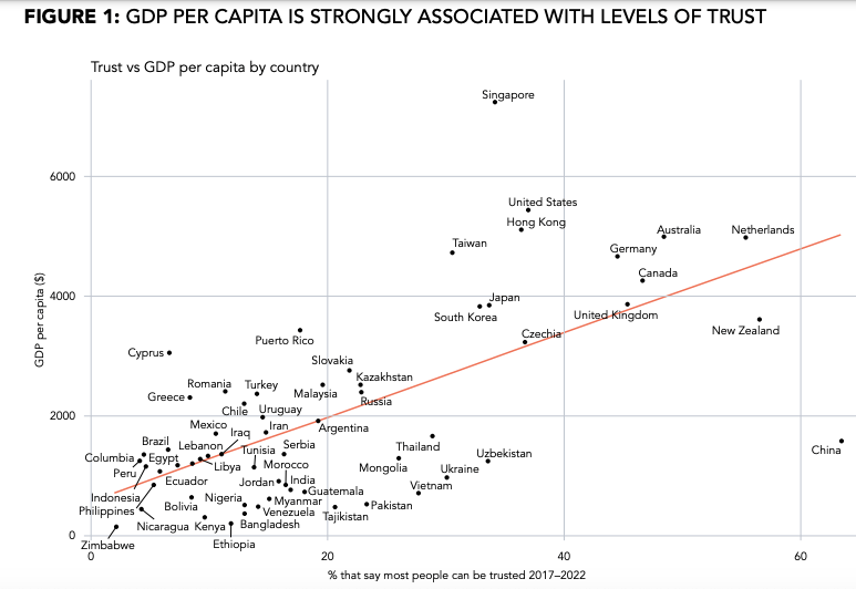 Note that the Social Capital report from Demos published yesterday has the graph below that shows how GDP Per Capital is strongly associated with levels of trust. I imagine you’d find similar with a more complex Human Development Index too – I cannot imagine economies and public services functioning in a society with little trust and high corruption.