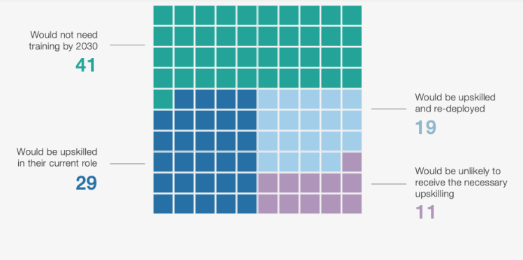 But this is one of the striking findings: the proportion of people in workforces who by the year 2030 would not be receiving any upskilling in an era where the deployment of technology is making redundant the use of human workers – such as on supermarket checkouts. (With the loss of social capital that is still to be appreciated).