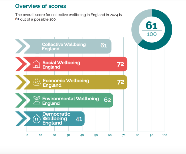 You can read the report here. On the four different categories of wellbeing measured – Economic, social, environmental, and democratic, it’s the last of these that England scores the worst