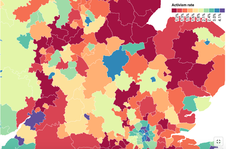 In Cambridgeshire the polarisation between Cambridge and the rest of the county is striking both in terms of the percentage of residents active (A population of around 150,000 with a volunteering rate of 3.7% indicates over 5,000 residents active in social and political campaigning). The other interesting stat is the number of activist groups per 1,000 population. Cambridge has 27 per 1,000 population, while Peterborough has 13. That doesn’t necessarily mean more is better. Back in 2013 I noticed that Cambridge had a plethora of standalone groups and campaigns that did not appear to be talking to each other at the time – and called for some consolidation in number.