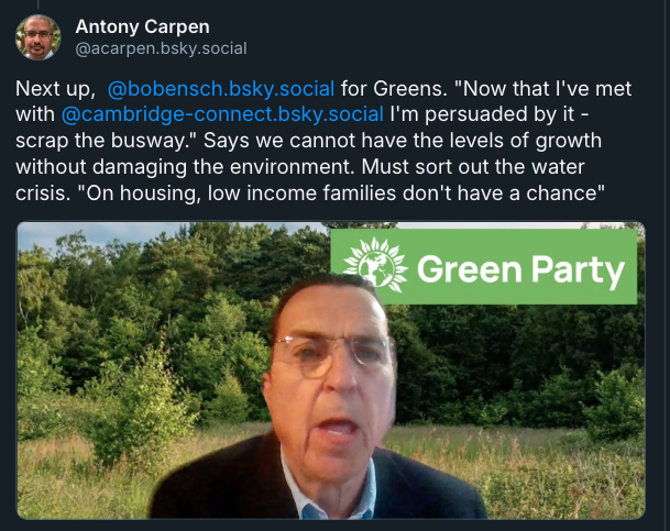 The biggest policy-change I picked up on was the clear statement of support for Cambridge Connect from The Green Party’s Bob Ensch.