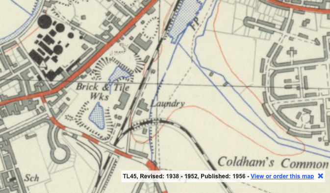 Above – Coldham’s Lane (white-and-orange-dashed line) with the main railway line and junction of the Cambridge-Newmarket railway, dated 1956. National Library of Scotland