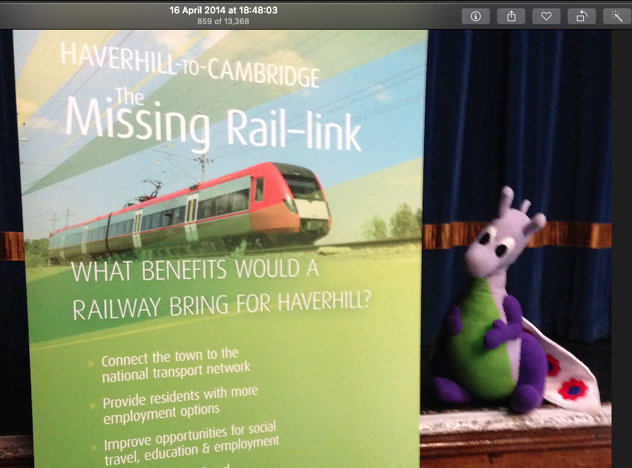 Image – Puffles the Dragon Fairy in Haverhill back in April 2014, linking up the town’s rail-reopening campaign with the emerging work on what became the GCP