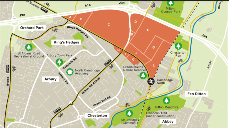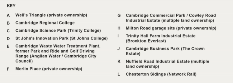 Above – Cambridge Business Park (at box J) is owned by Crown Estates. The Chesterton Sidings (at box L) is Brookgate’s development for Network Rail and others. The Anglian Water Works site (at box E) is the Hartree redevelopment. Furthermore, Trinity Hall Farm is being redeveloped (at box I) by Brockton Everlast.
