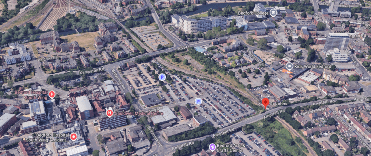 Above from G-Maps: The red H buildings (Bedford Hospital), the red balloon bottom-right (Bedford St John’s railway station which will be moved slightly further up), and top right in the grey and white hat symbol, Bedford College)