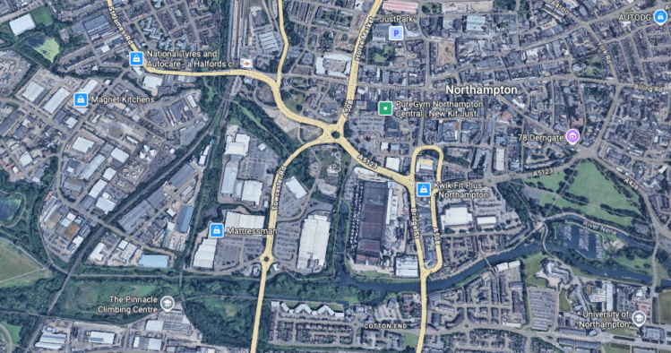 Above – Northampton on G-Maps with the University of Northampton at the bottom right of the image, and the railway station top-centre/left.