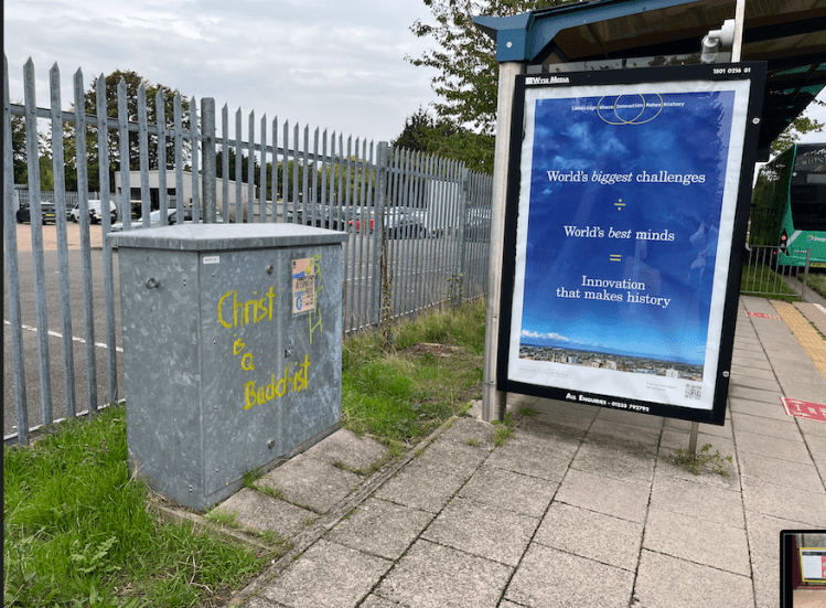 Above – the jarring impact of the advert (with foliage growing out of the ground) with the grafitti combined with the security fencing separating it from the Milton Road Garage (understandable given the motor assets) makes for an unpleasant arrival.