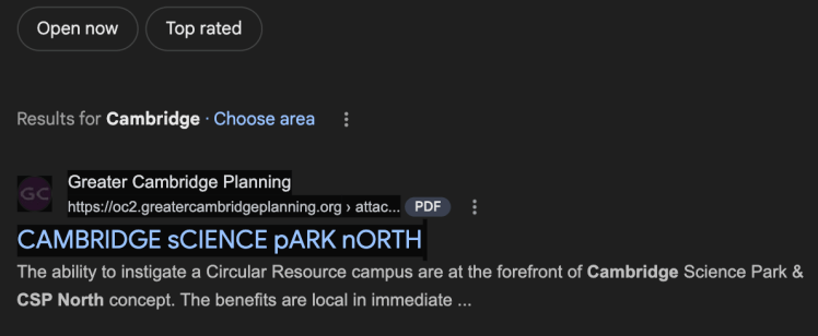 Above – nothing comes up when I search the landing page https://oc2.greatercambridgeplanning.org/ yet clearly there is a document about ‘CSP North – because I was able to access it