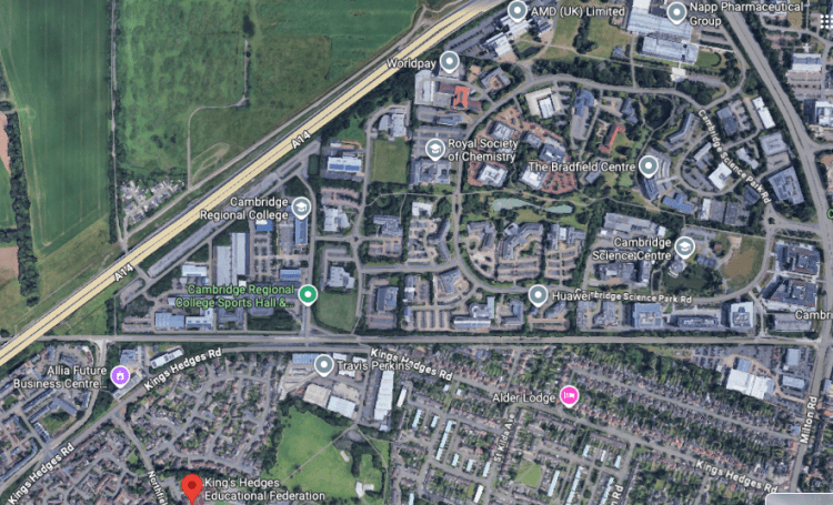 Above – from G-Maps here. Cambridge Regional College used to have some green space for its students but it has all been built upon. Which is why I think a new wide ‘green corridor’ that covers the A14 in a tunnel to enable pedestrian access to open green space (and some sports pitches too) is long overdue
