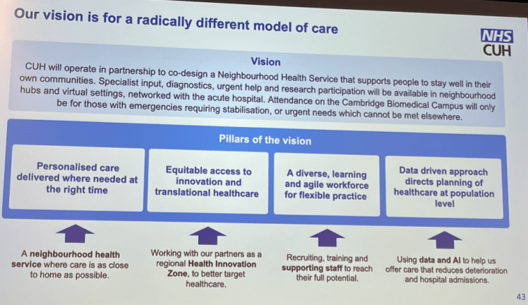 The Cambridge Biomedical Campus Vision 2050 hinted at a new acute hospital to replace the ageing existing hospital that was built in the 1970s. At today’s CBC Open Forum (sign up here if you want advance notice of the next one)